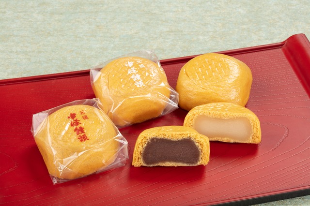 【黒あん】甘さ控えめで、あっさりとした味わい、滑らかな舌触りが特徴のこしあんです。中條饅頭といえば、「黒あん」。常連さんの中には「黒あんでなくては!」という方も多い看板の味です。 【白あん】いんげん豆と上質なグラニュー糖を使用した、上品な甘さの白あんです。中條屋の専務は「黒あんよりも白あん派!」。若い人にも人気の味わいです。 中條屋の「中條饅頭」は、最盛期ともなれば、1日に1万個~2万個の需要がある大人気の温泉饅頭。その日の気温や湿度に合わせて水分量や練り時間を変える丁寧な製法で、毎日手作りしています。一番の特徴は、柔らかでふっくらふわふわの生地。ほんのり黒糖の甘みと香ばしさを感じる自慢の皮に仕上げています。中に包まれるのは、滑らかな舌触りであっさりとした味わいの黒あんと、いんげん豆の上品な甘さが人気の白あんの2種類。どちらも根強い人気の味です。